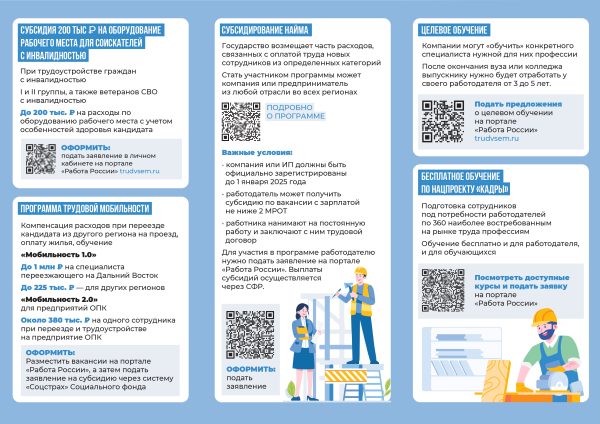 Министерство труда и социальной защиты Республики Крым в целях расширения информационной и разъяснительной кампании о реализации мероприятий национального проекта «Кадры», направленных на содействие занятости населения, направляет для использования в работе и информирования организаций курируемых сфер деятельности информационные карточки по мероприятиям:
